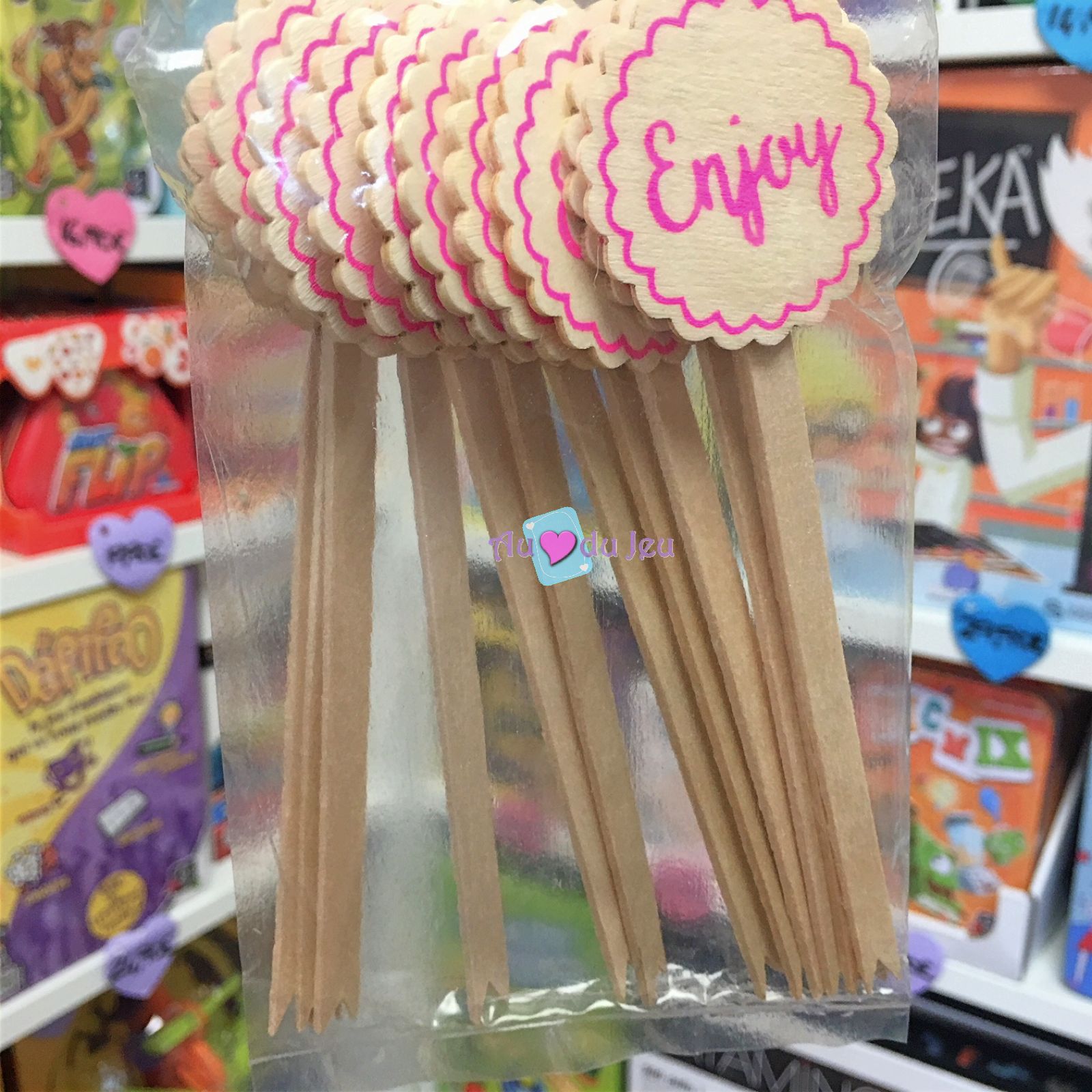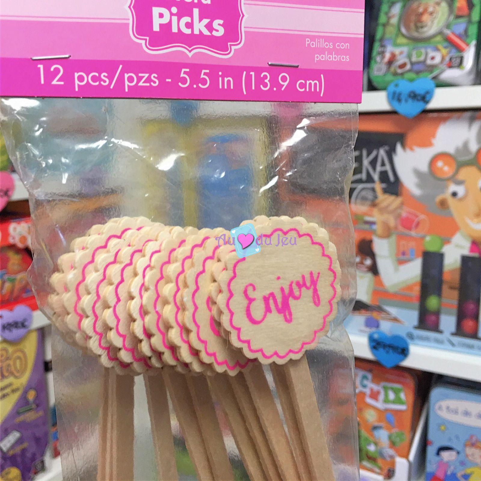 12 piques an bois Enjoy rose, parfaits pour vos apéritifs et cocktails. Les piques mesurent 14 cm.