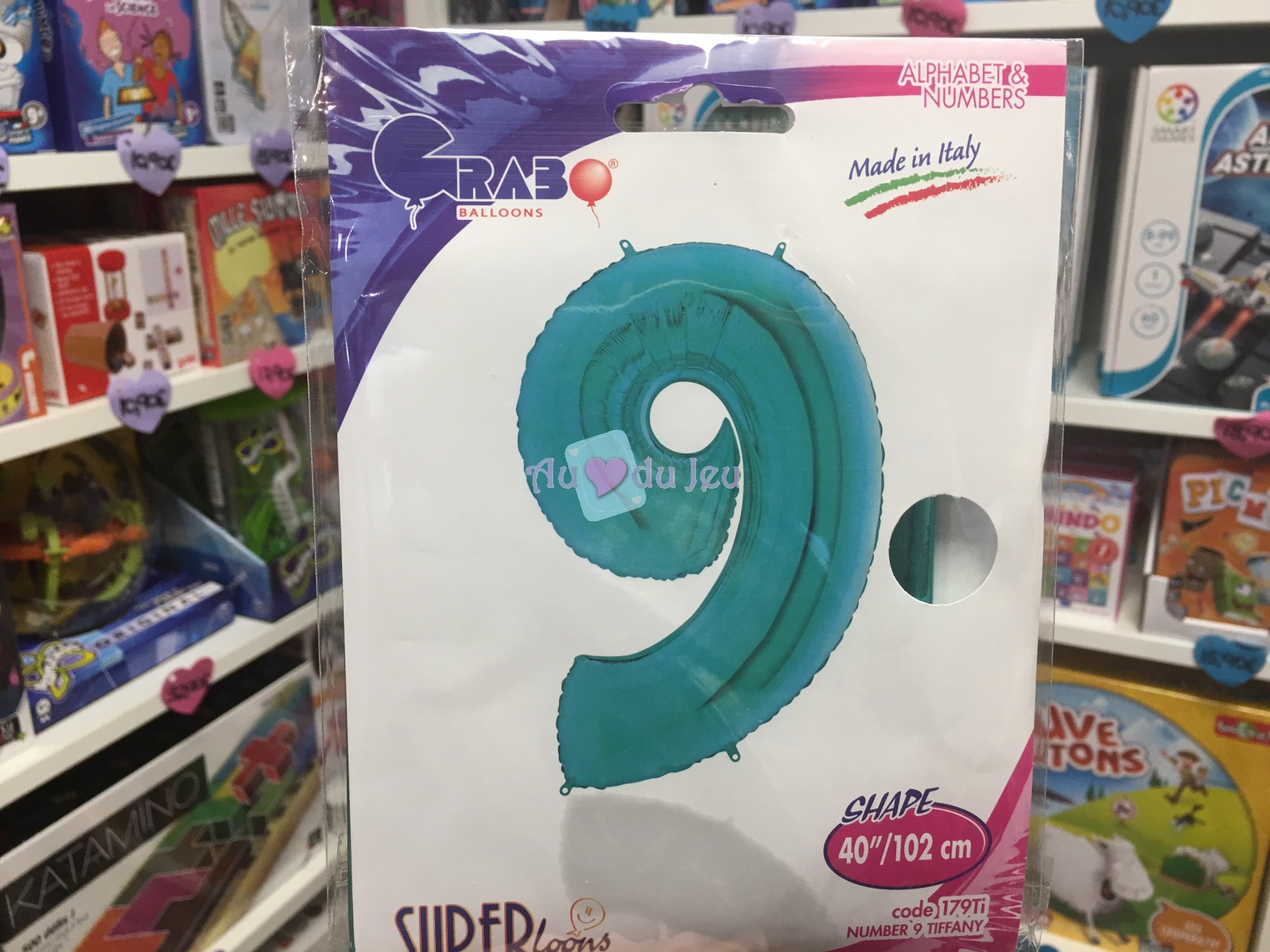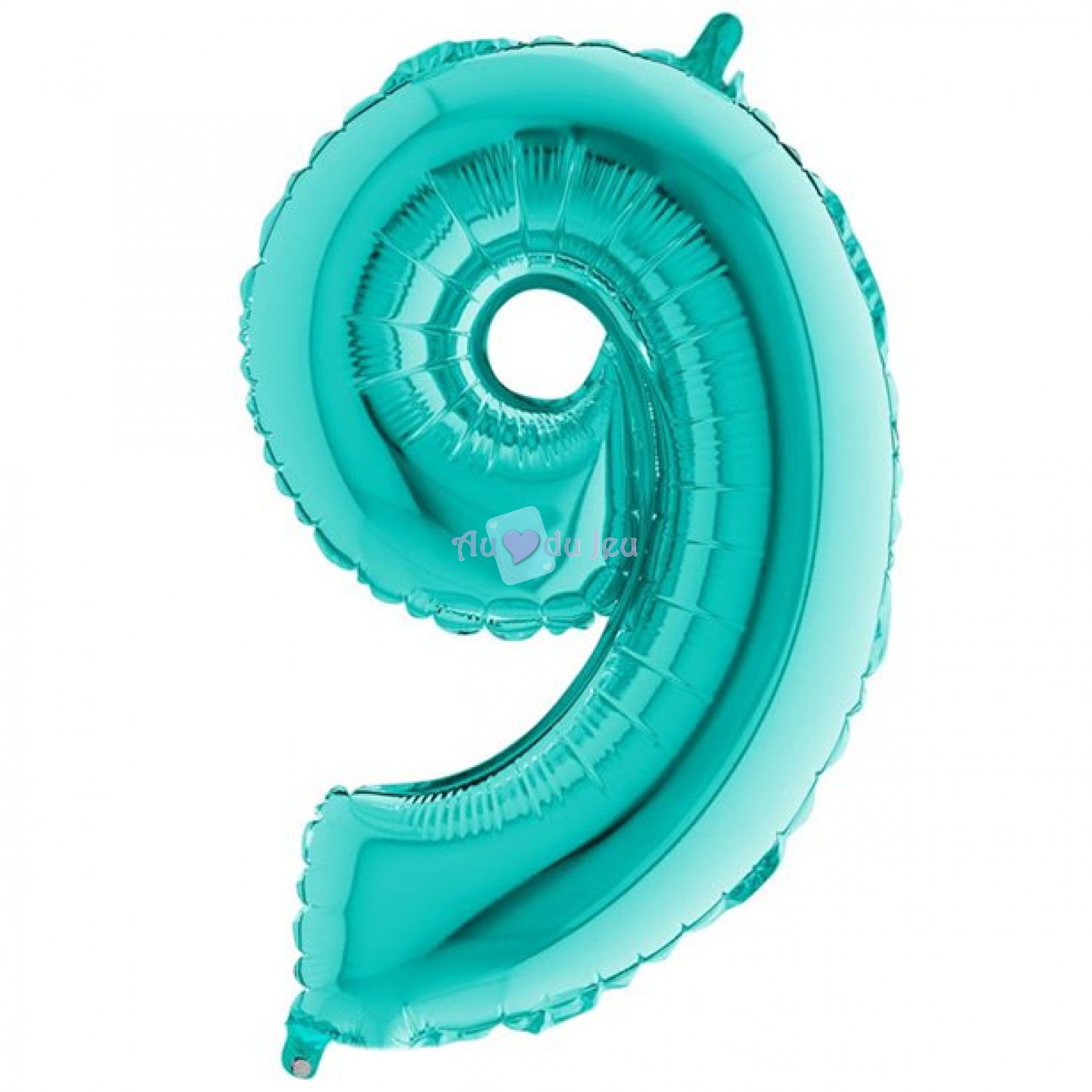 Ballon anniversaire chiffre 9 en aluminium de couleur bleu Tiffany (turquoise) et mesurant 86 cm. Le ballon est vendu non gonflé. Il peut être gonflé soit à l’hélium, soit à l’air à l’aide d’une paille. Gonflé à l’hélium, la durée de flotaison est de plusieurs jours.