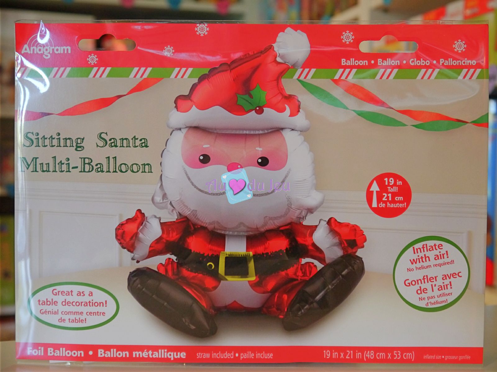 Ballon de 48cm x 53cm représentant le Père Noël. Idéal pour sublimer vos décorations de Noel. Le ballon se facilement à l’air grâce à une paille.