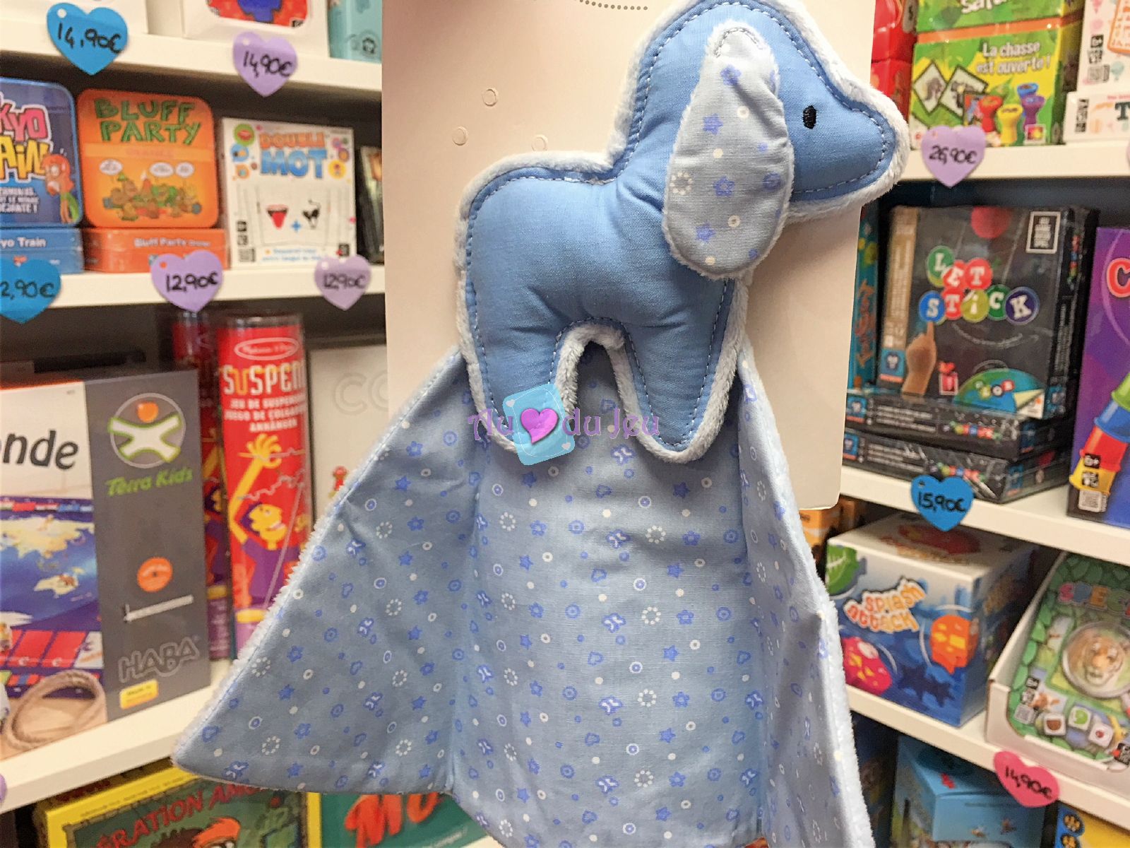 Doudou chien bleu en velours et coton de 27 x 4,5 x 27 cm. Idéal pour les tout-petits.