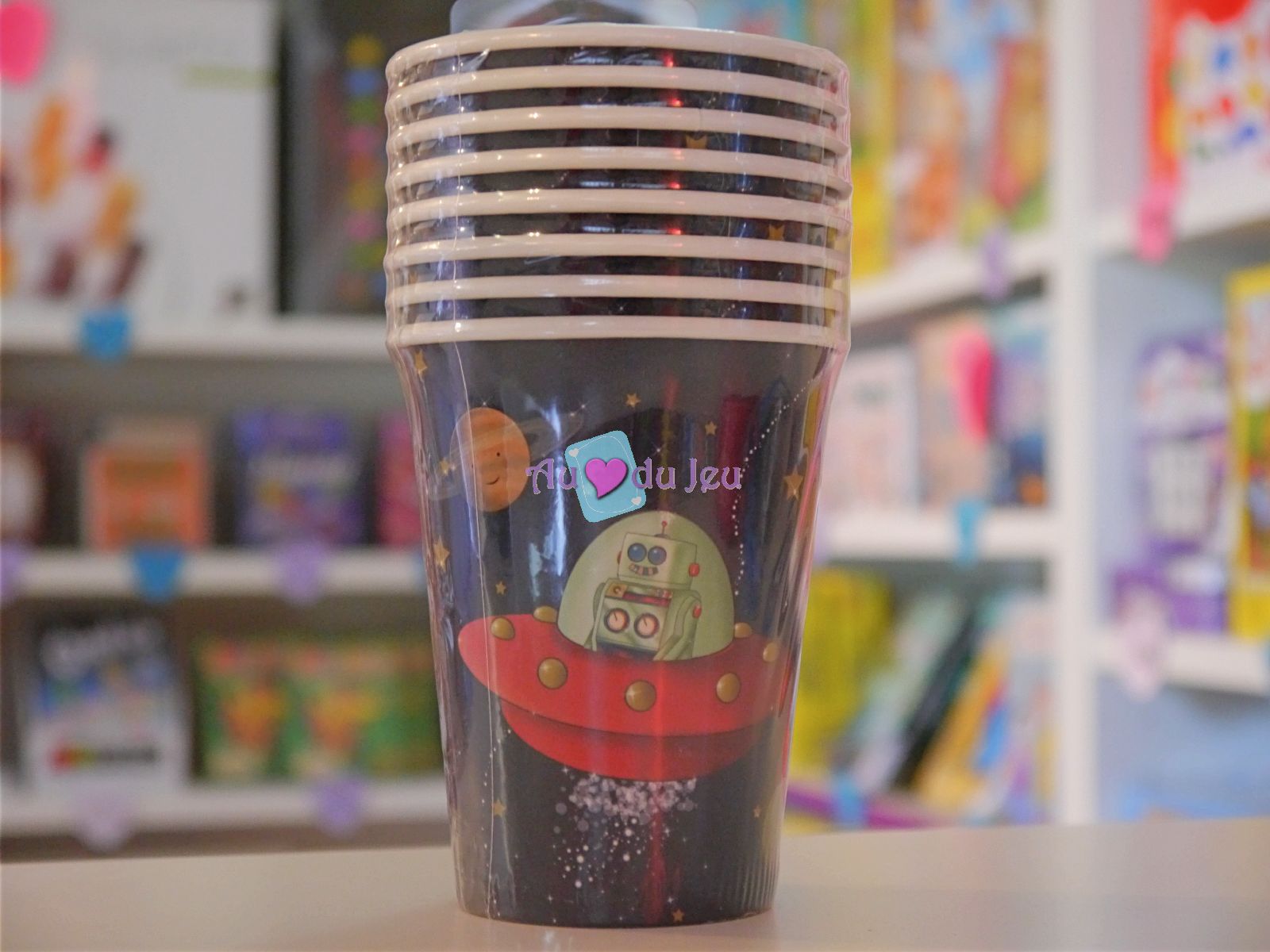 8 gobelets en carton sur le thème de l’espace, pour décorer votre table d’anniversaire, fête ou goûter.